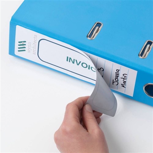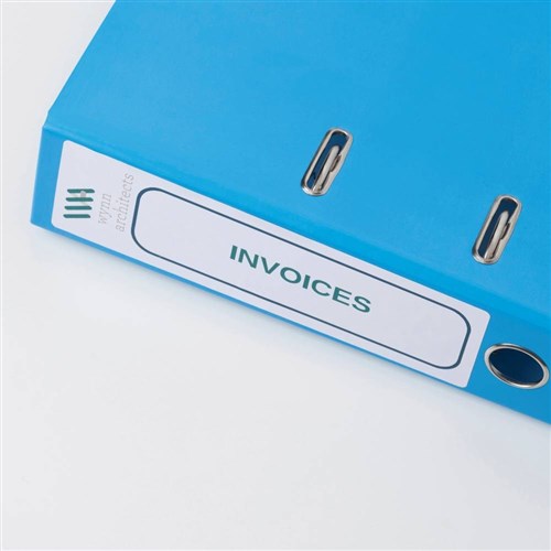 • Specially designed labels to fit the spine of lever arch, ring binders, elasticated folders, box files, suspension files, document wallets and square cut folders.